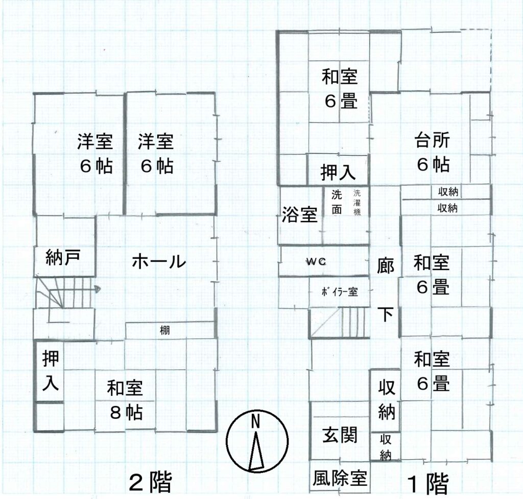 | 間取り/築年月日 | 木造 2階建て:6DK + 納戸付 昭和60年9月新築 |